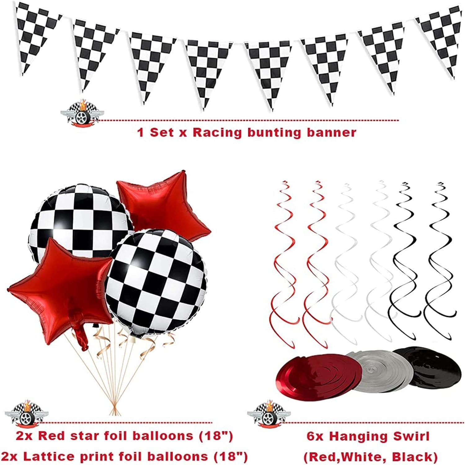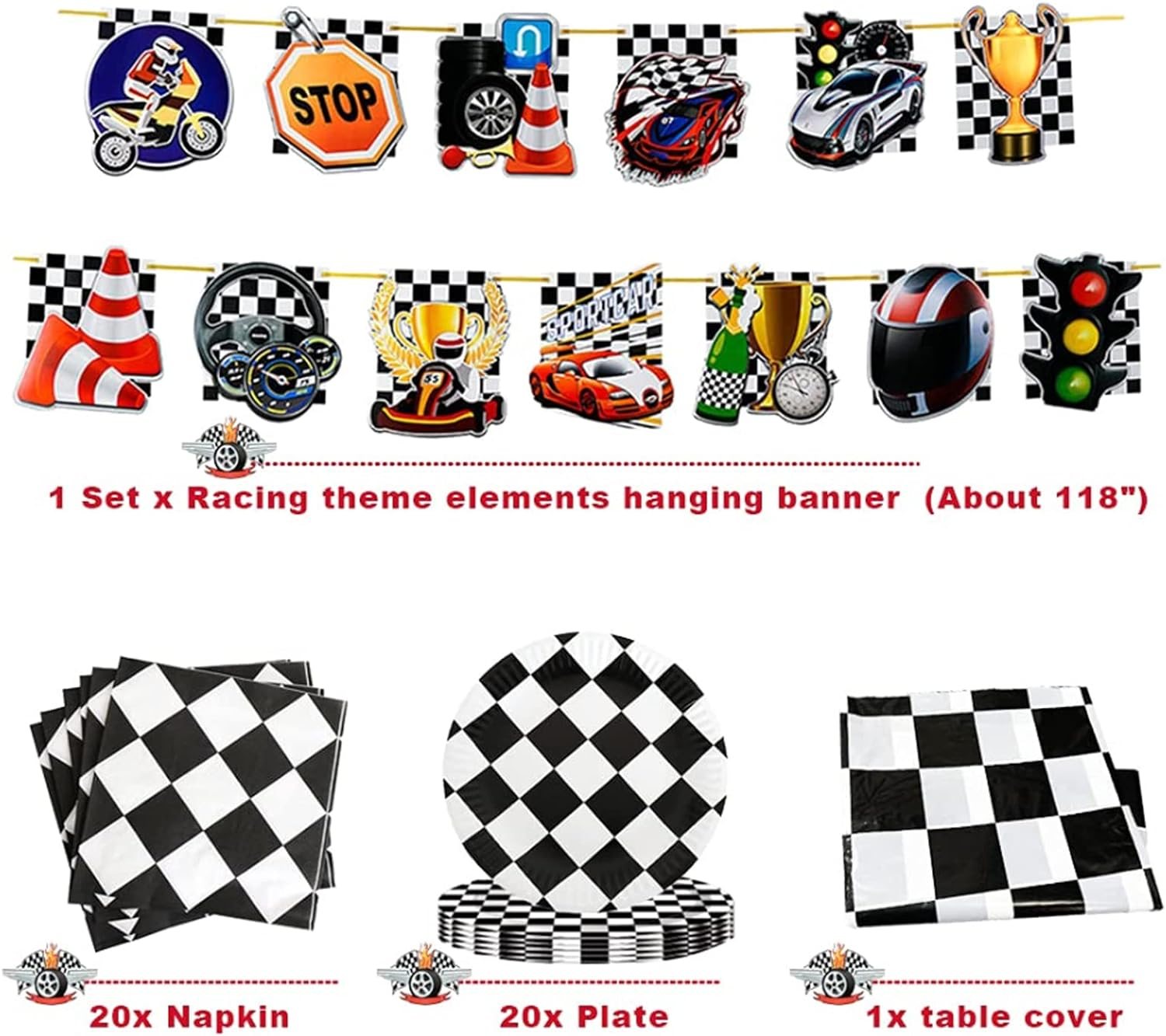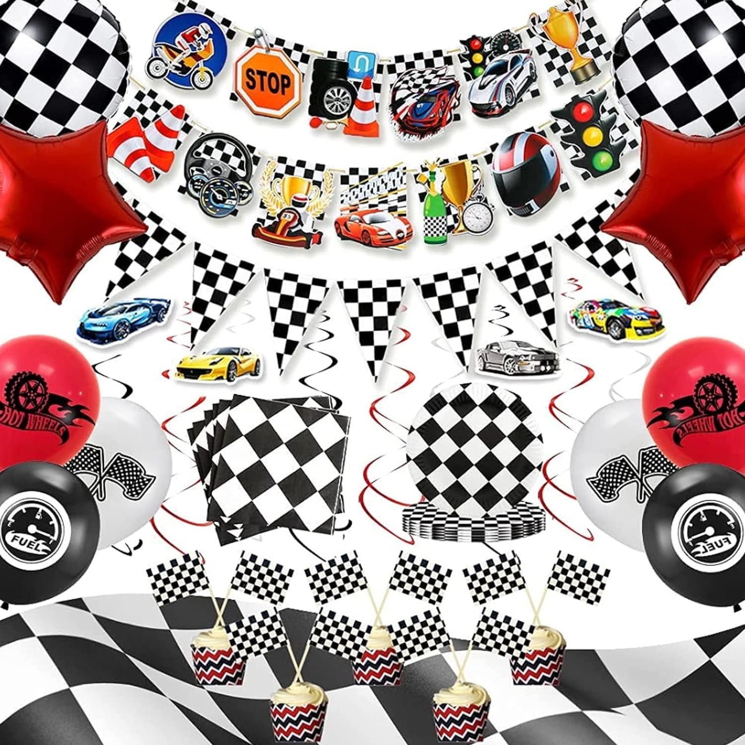 【レーシングカーパーティーに行こう!男の子のためのとてもクールなレーシングパーティー、あなたのエンジンを始動し、祝うために私たちのパーティーにレースを続けてください。準備ができているものは次のとおりです。1xテーブルクロス、1 xチェッカーホオジロバナー(10個)、2 x白黒グリッドプリントフォイルバルーン、2 xフォイルスターバルーン、6 xハンギングデコレーション、12xレーシングカーテーマエレメントプリントラテックス風船(黒、白、赤)、13 xレーシングカー要素吊り下げ装飾、20 x Npakin、20 xプレート、20x。レーシングカーエレメントプリントステッカー