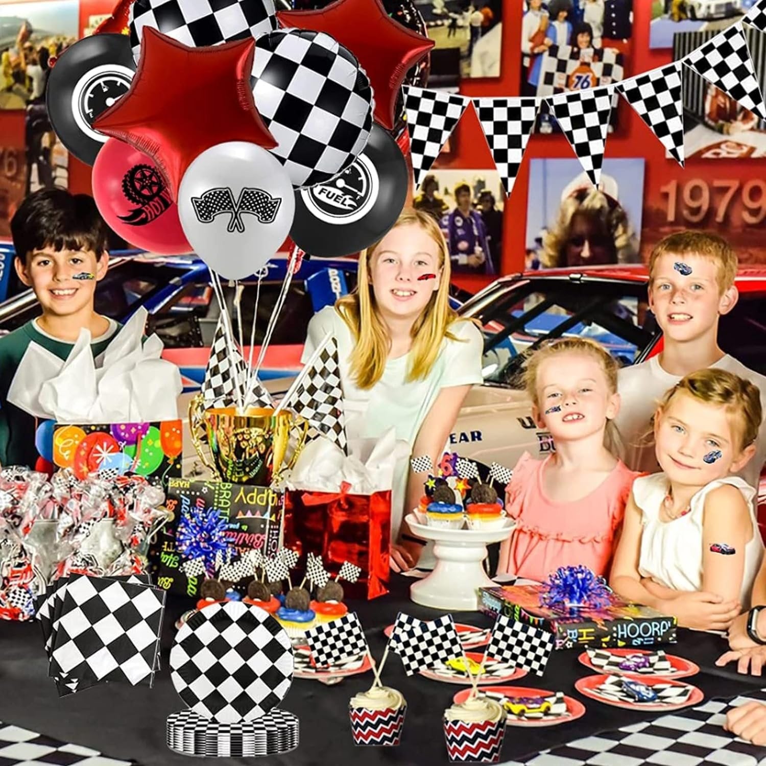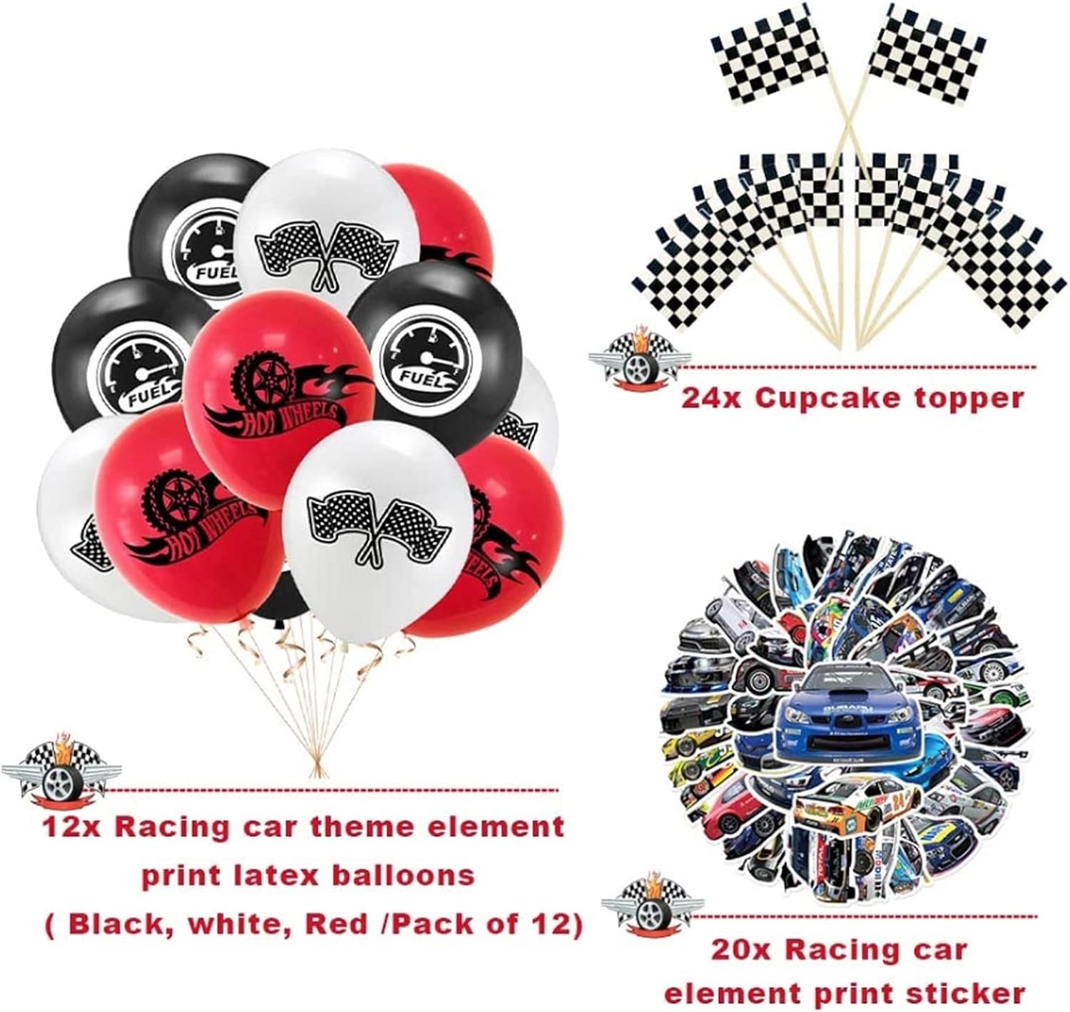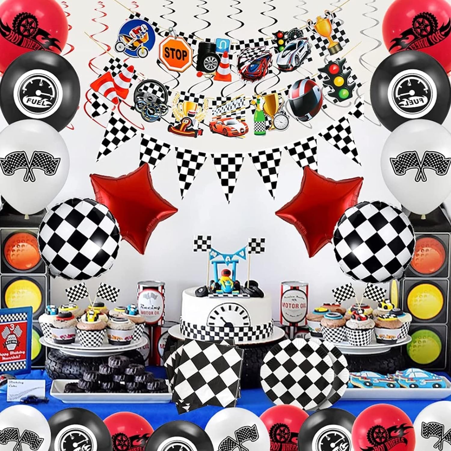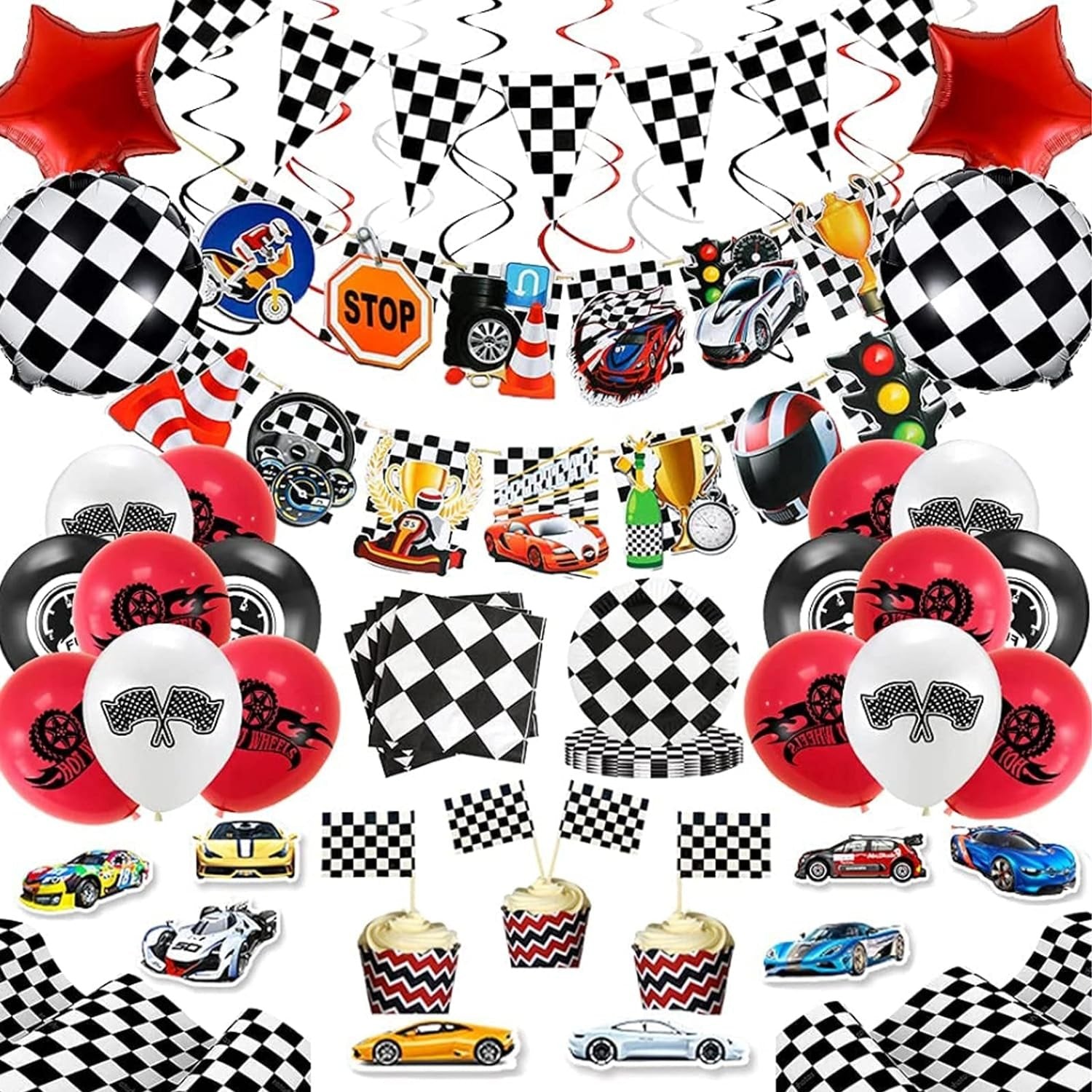 【レーシングカーパーティーに行こう!男の子のためのとてもクールなレーシングパーティー、あなたのエンジンを始動し、祝うために私たちのパーティーにレースを続けてください。準備ができているものは次のとおりです。1xテーブルクロス、1 xチェッカーホオジロバナー(10個)、2 x白黒グリッドプリントフォイルバルーン、2 xフォイルスターバルーン、6 xハンギングデコレーション、12xレーシングカーテーマエレメントプリントラテックス風船(黒、白、赤)、13 xレーシングカー要素吊り下げ装飾、20 x Npakin、20 xプレート、20x。レーシングカーエレメントプリントステッカー