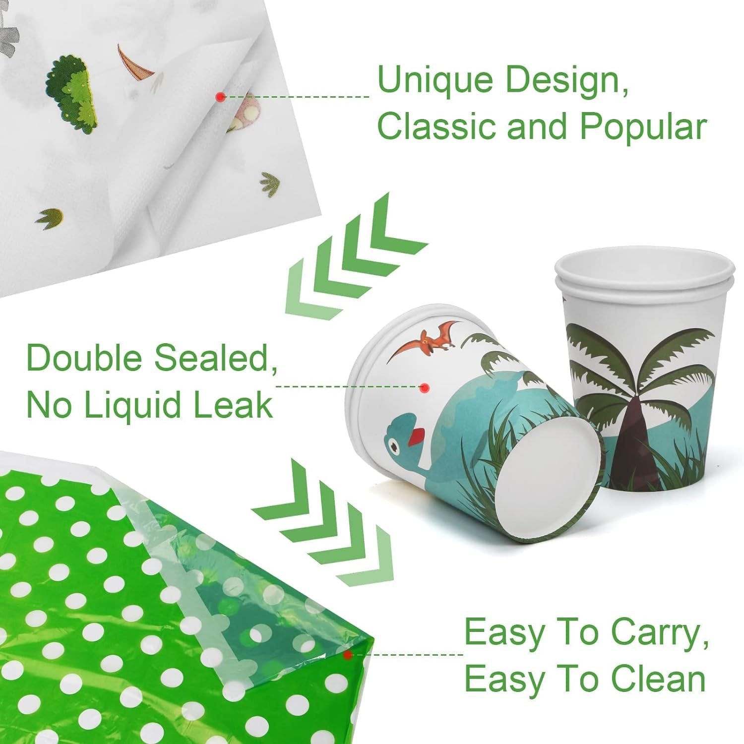 恐竜食器セット:10 x 9インチの紙皿、10 x 7インチの紙皿、10 x紙コップ、10 xストロー、20 xナプキン、1xテーブルクロス。 プレミアム素材:お皿、カップ、ナプキンはすべて紙でできています。 紙皿やカップには、温かい食べ物、ケーキ、その他の食べ物や飲み物を入れることができます。