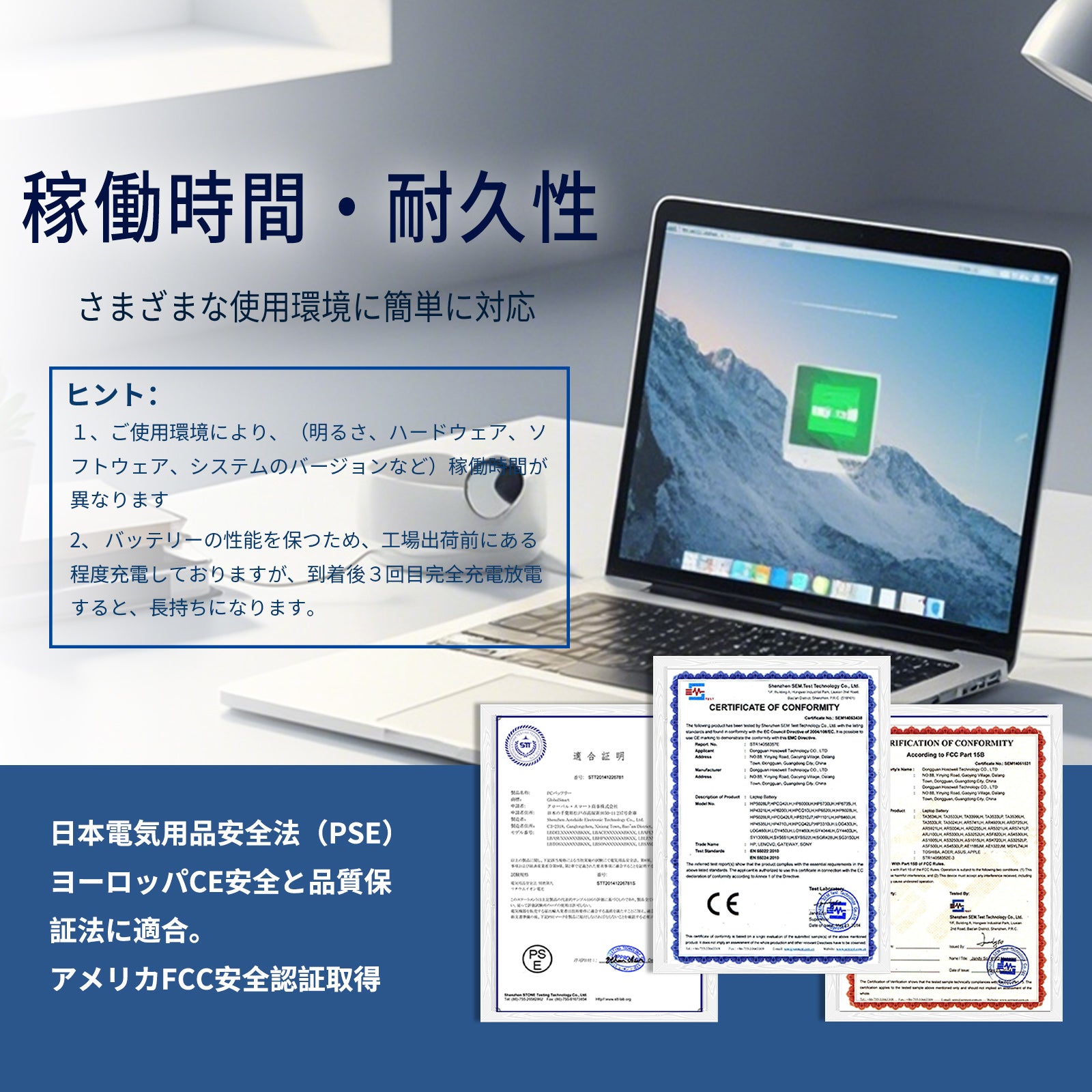 弊社全品日本(電気用品安全法)、ヨーロッパCE安全法に適合、アメリカFCC承認取得 ご注意:ご購入前に、パソコンと純正バッテリーの型番を確認する必要となります。