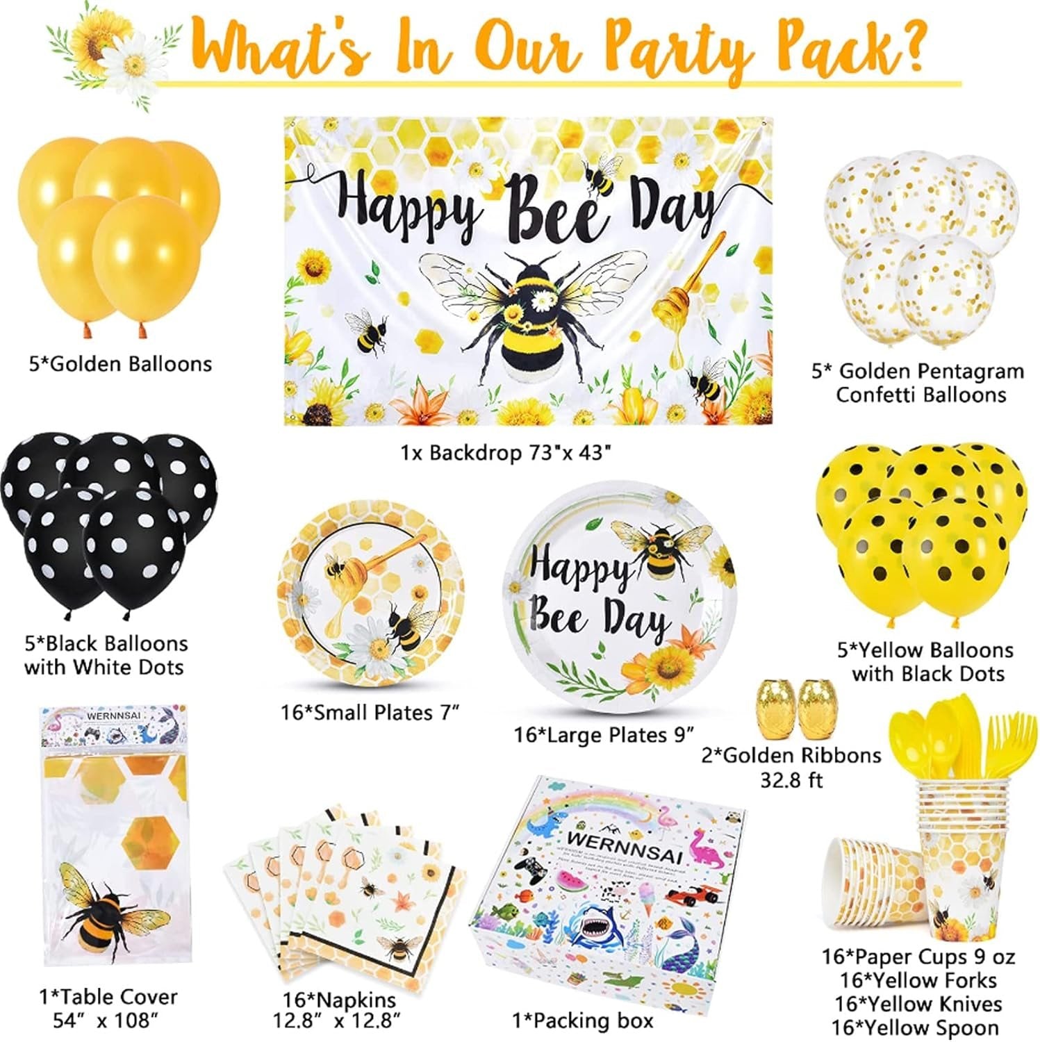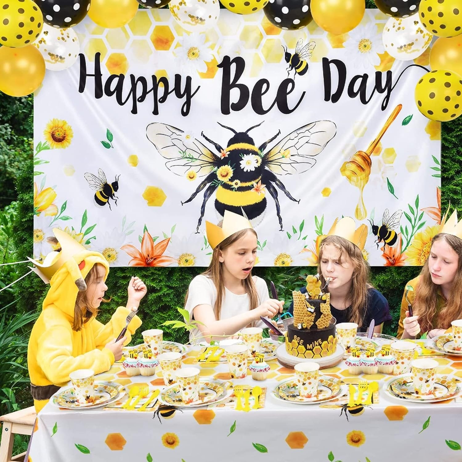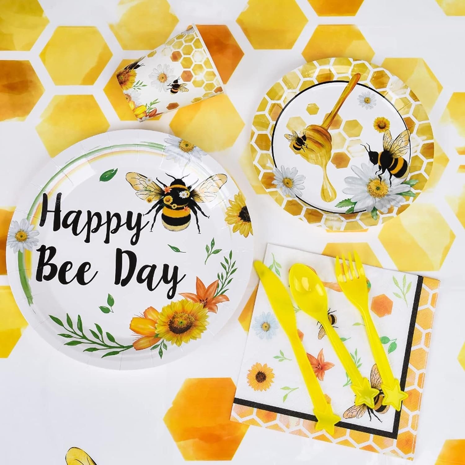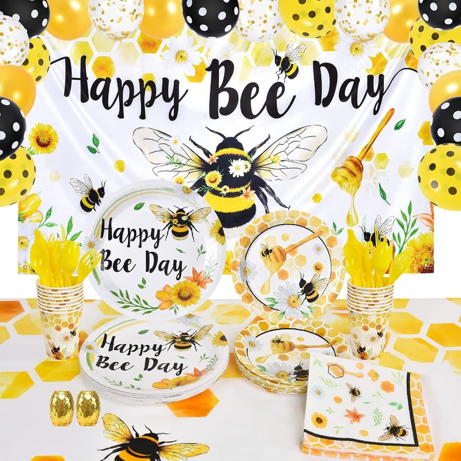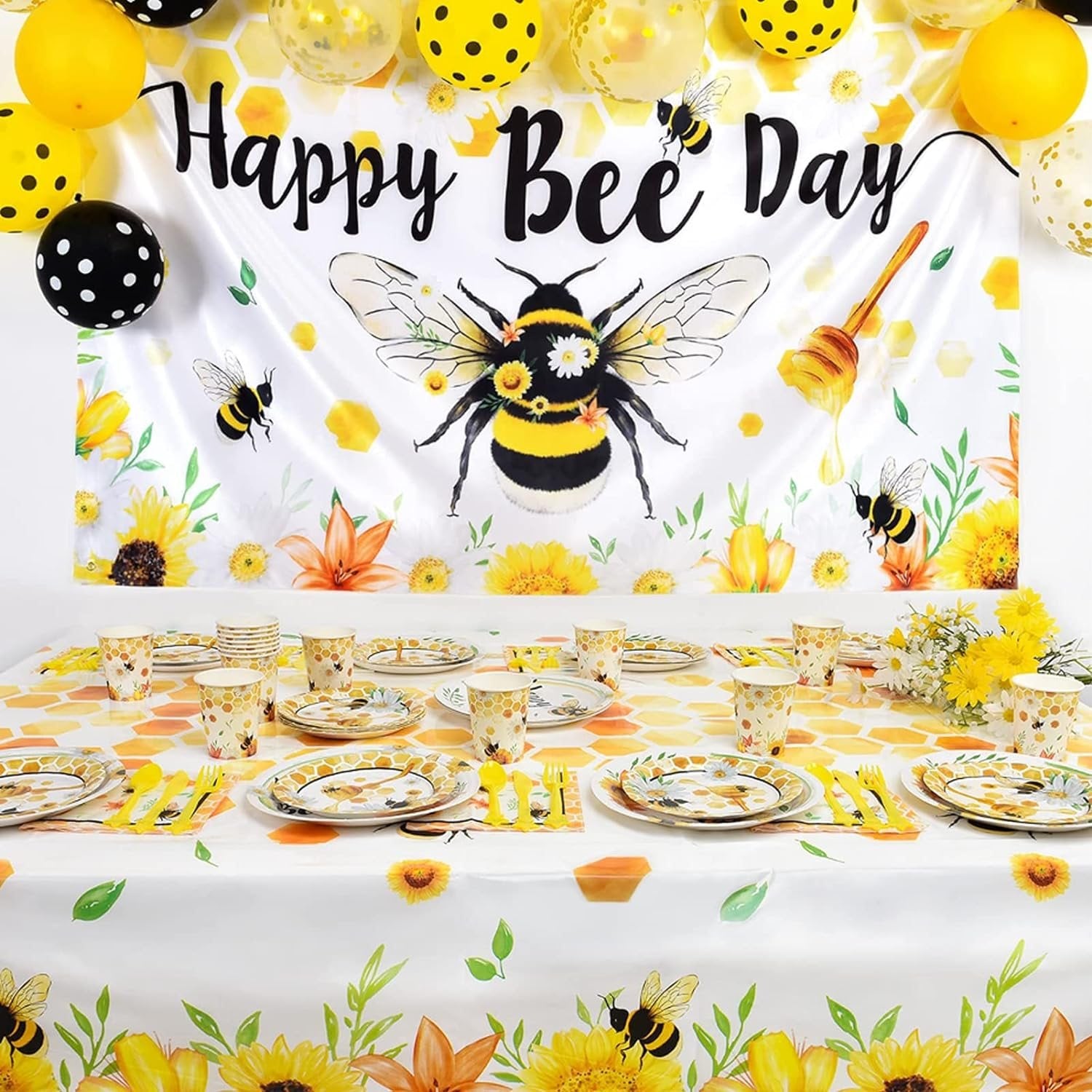 -私たちの蜂のパーティー用品セットには、10個のパーティーアクセサリーが含まれています。 背景、風船、テーブルクロス、皿、カップ、ナプキン、ナイフ、フォーク、スプーンが含まれます。